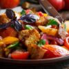 Тем временем нарезаем кубиками среднего размера свинину. Чуть смазываем маслом антипригарную сковородку. Быстро обжариваем кусочки свинины до румяности на сильном огне. Отправляем обжаренное мясо к овощам.